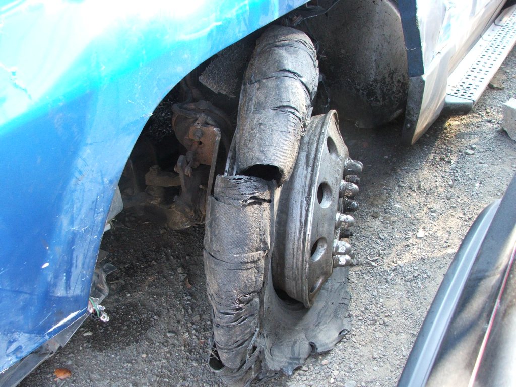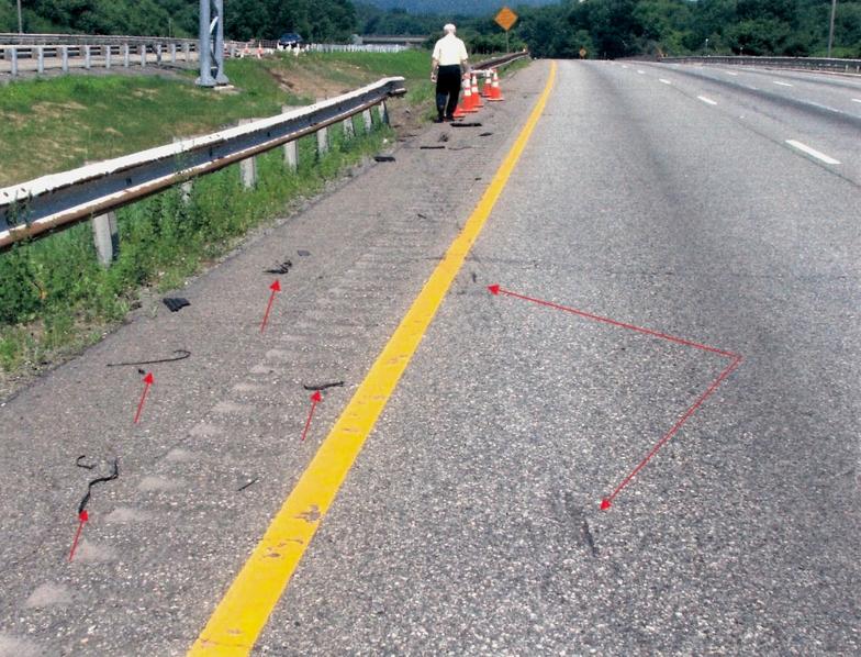 Red arrows pointing to pieces of broken tire and onset of the flat tire scuff